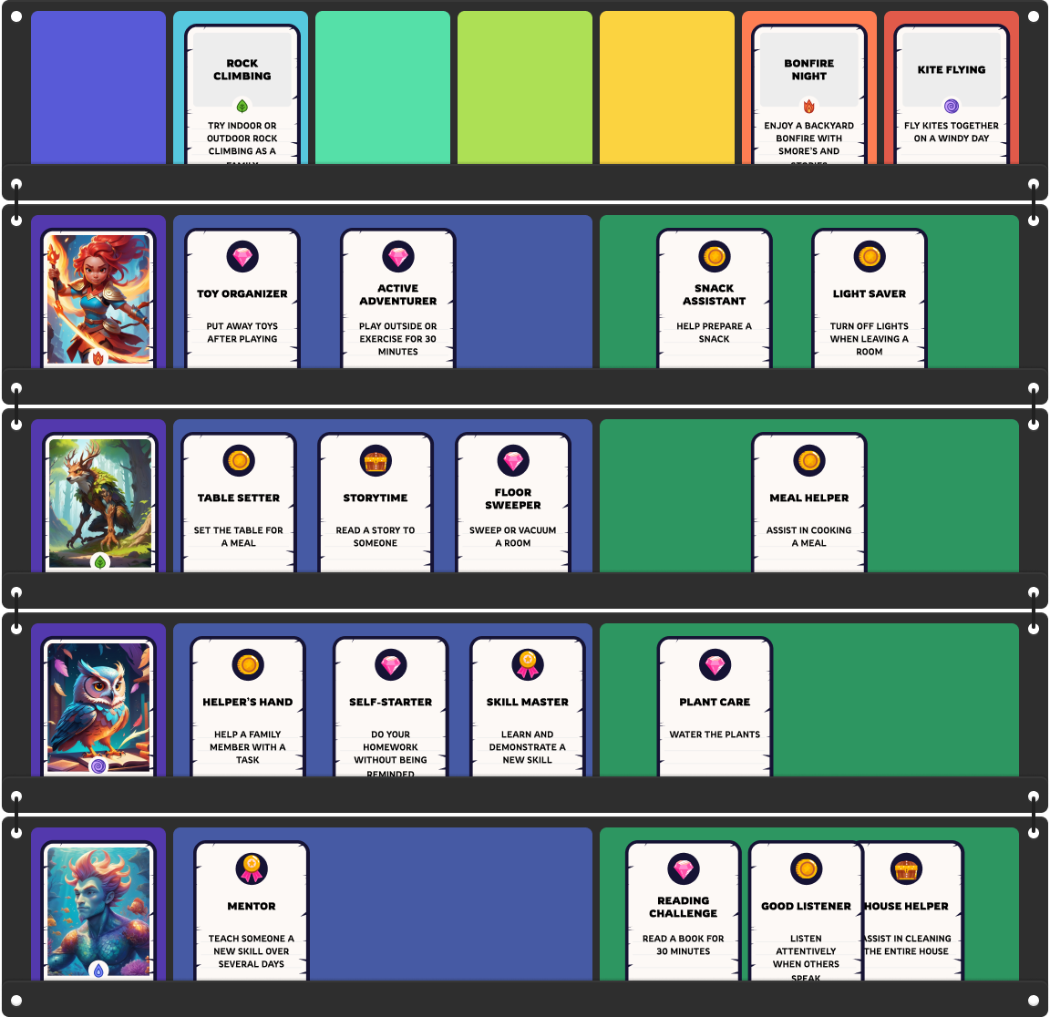 Set up the board and select and customise Quest Cards to make it fair inclusive and fun for all family members.